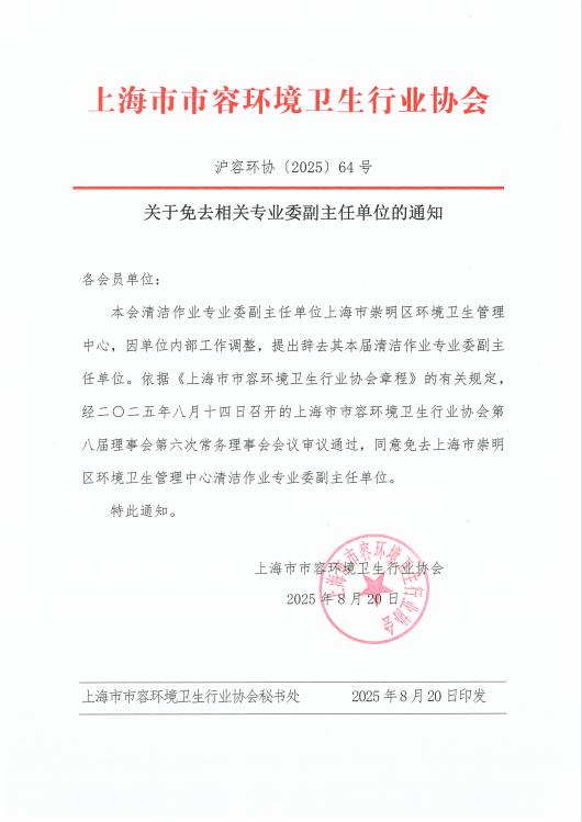 上海市市容环境卫生行业协会关于免去相关专业委副主任单位的通知