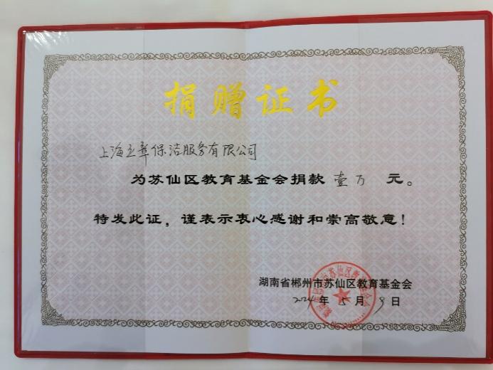 上海立章保洁服务有限公司党支部书记、总经理周玉华向苏仙区教育基金会捐款10000元整。接受了由湖南省郴州市苏仙区教育基金会颁发的证书。